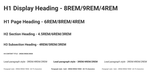 This is an example of typography at the atomic level. We define size, weight, line height and spacing for each type style. We create different ‘rules’ for Desktop, Tablet and Mobile to ensure the type looks its best no matter which device is used.
